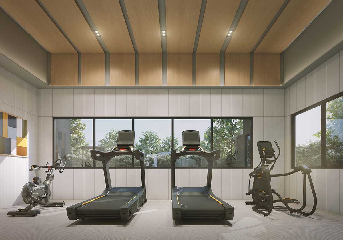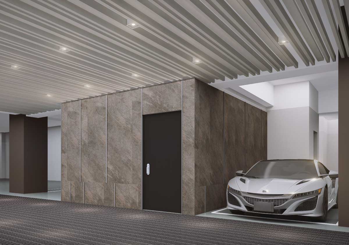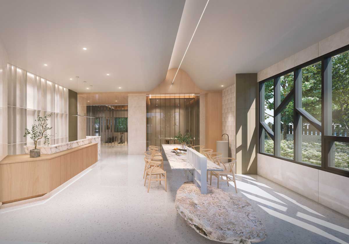 公設展演是迎賓的門面,也是回家的引導,「昌傑玥玥」形隨機能,簡而繁、繁而簡,和環境產生連結跟共鳴,構建出美的尺度。入口處退縮,是進入建築前的沉澱,迎賓區轉化為斜屋頂的概念,牆面適度開口引景入室,也將視覺延伸到戶外,運用材質界定不同的機能屬性,創造複合式的、凝鍊空間的生活品味。